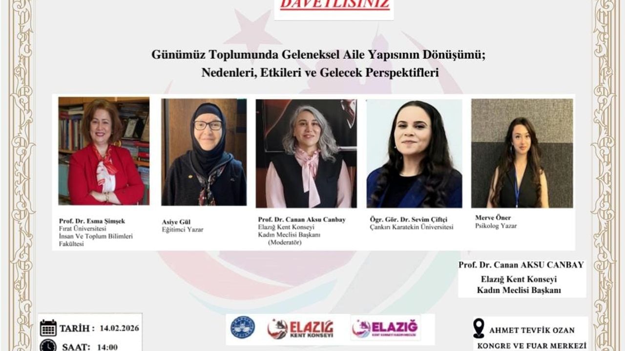 Alanında uzman akademisyenler ve Elazığlı kadın yazarların katılımıyla düzenlenecek panelde; aile kurumunun yaşadığı dönüşüm, bu dönüşümün toplumsal etkileri ve geleceğe yansımaları ele alınacak.
