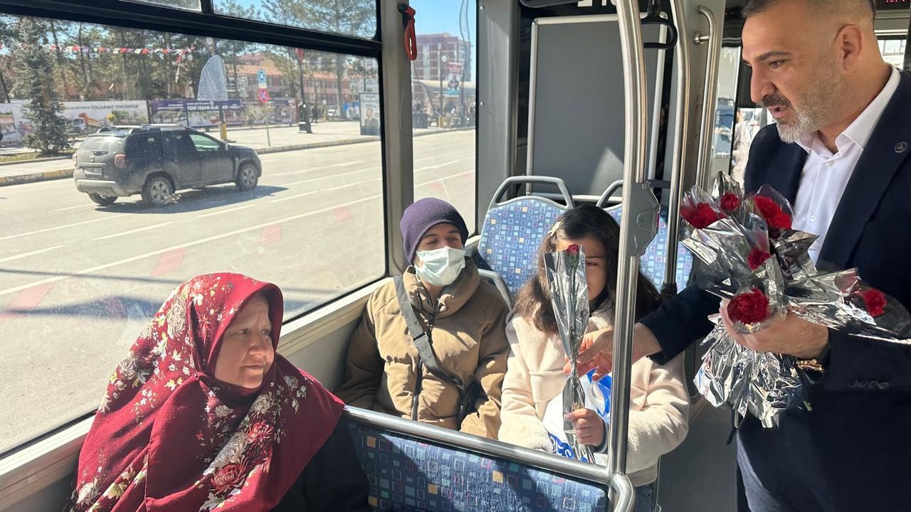 Ulaşım Hizmetleri Müdürlüğü ekipleri gün boyunca şehir merkezindeki toplu taşıma noktalarında kadınlara çiçek dağıtarak 8 Mart Dünya Kadınlar Günü’nü kutladı.