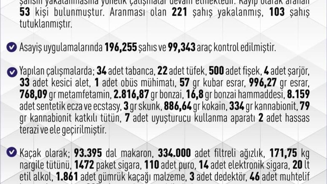 Yürütülen operasyonlarda 34 tabanca, 22 tüfek, 500 fişek, 4 şarjör ve 33 kesici alet ile 1 obüs mühimmatı, 57 gram kubar esrar, 996,27 gram esrar, 768,09 gram metamfetamin, 2 bin 816,87 gram bonzai, 16,8 gram bonzai hammaddesi, 8 bin 159 adet sentetik ecza ve ecstasy, 3 gram skunk, 886,64 gram kokain, 334 gram kannabionit, 79 gram kannabionit katkılı tütün ile 7 adet uyuşturucu kullanma aparatı, 2 hassas terazi, 93 bin 395 dal makaron, 334 bin adet filtreli ağızlık, 171,75 kilogram nargile tütünü, 1472 paket sigara, 110 puro, 14 elektronik sigara, 20 litre etil alkol, 1861 adet gümrük kaçağı malzeme, 3 dedektör, 46 adet muhtelif kazı malzemesi ve 395 adet emtia ele geçirildi.