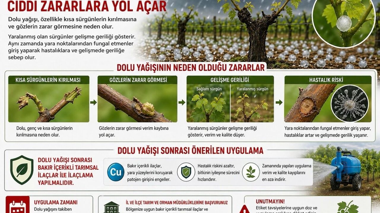 Yapılan değerlendirmelere göre dolu yağışı, özellikle genç ve kısa sürgünlerde kırılmalara yol açtı. Bu durumun bitkinin gelişimini sekteye uğrattığı ve sezon boyunca ürün kaybını artırabileceği vurgulandı. Gözlerde meydana gelen zararların ise üzüm salkımı oluşumunu doğrudan etkilediği bildirildi.