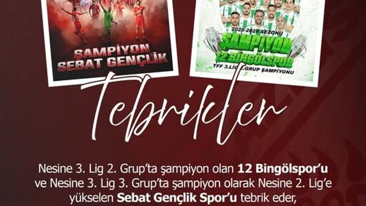 “Nesine 3. Lig 2. Grupta şampiyon olan 12 Bingölspor ile 3. Grupta şampiyon olan Sebat Gençlikspor’u tebrik ederiz. 2. Lige hoş geldiniz, yeni sezonda başarılar dileriz.”
